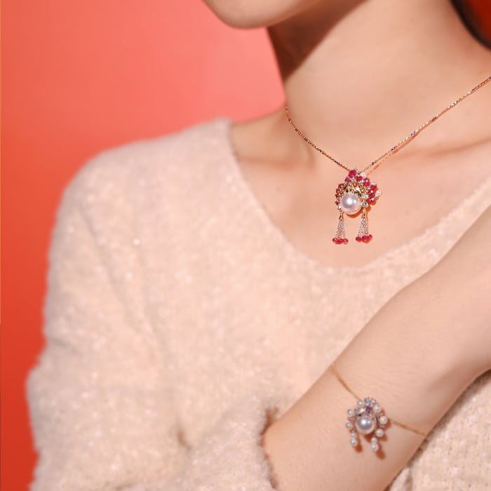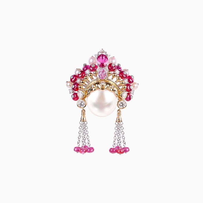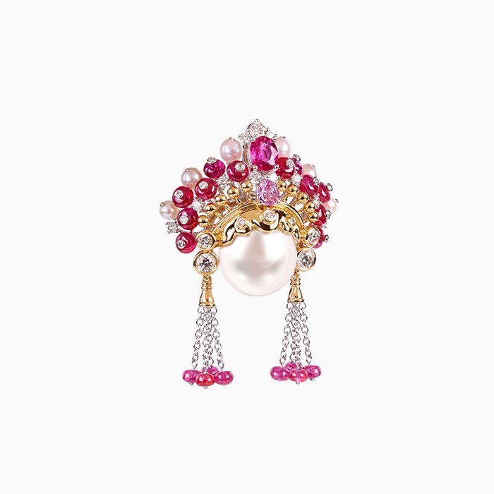 18K黃金與18K白金材質, 南洋珠, 日本珍珠, 紅寶石, 彩剛與白鑽石。