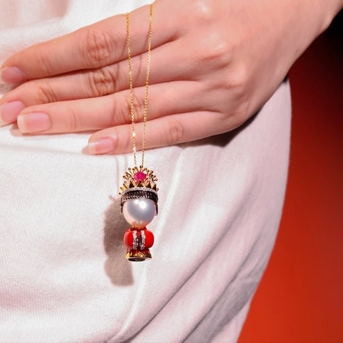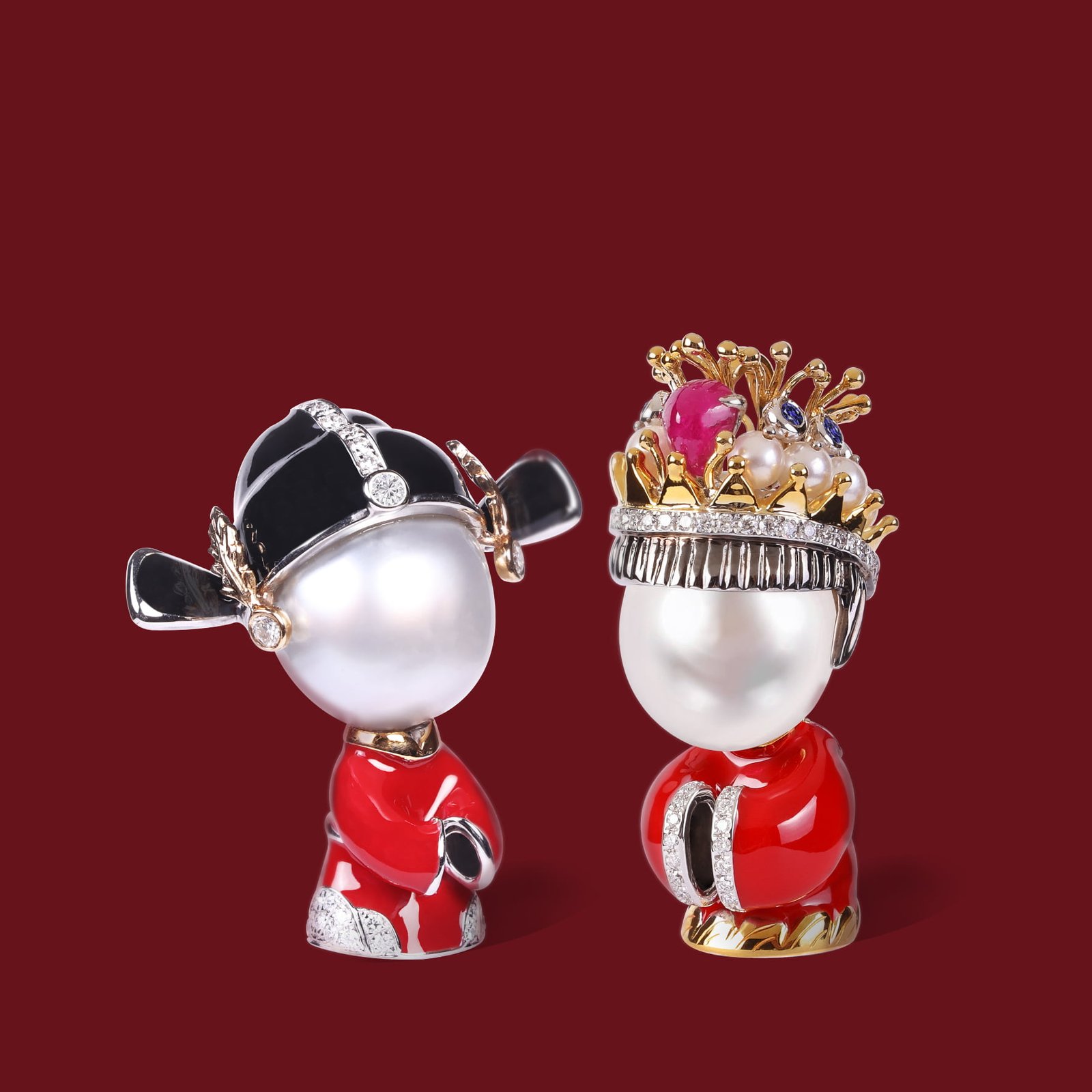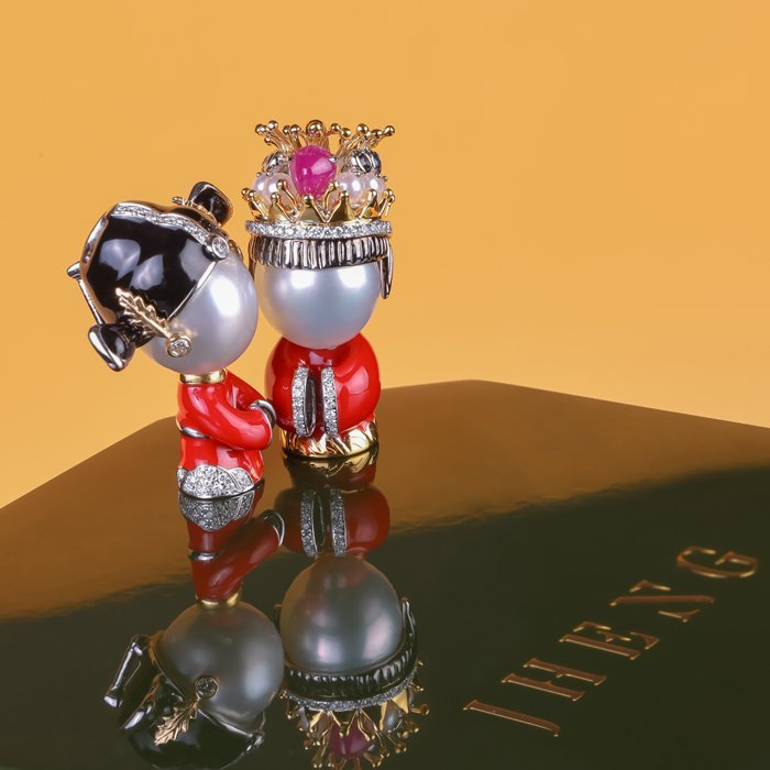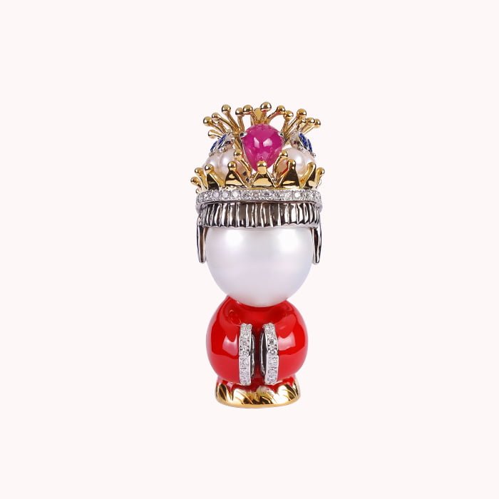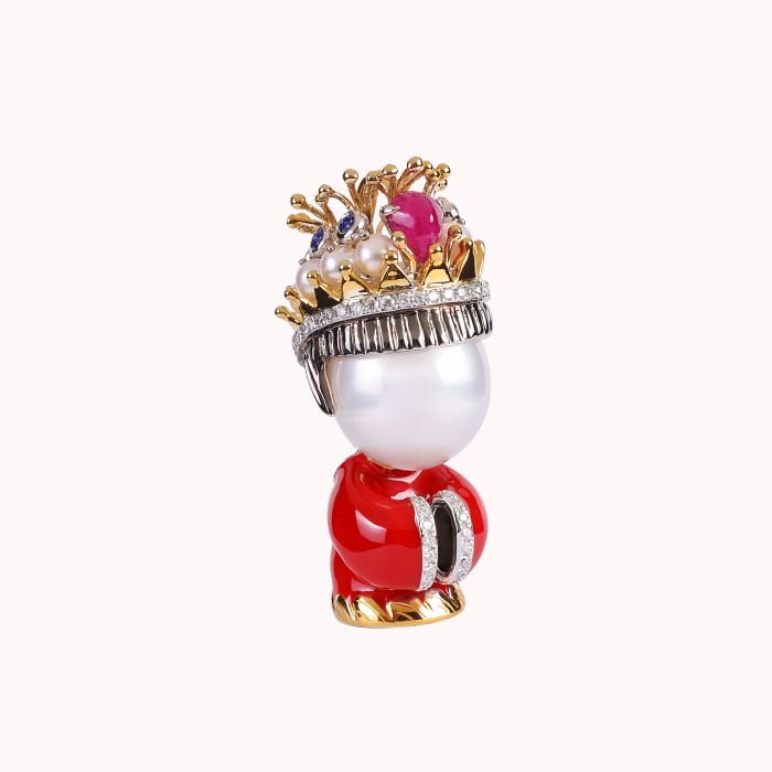 18K黃金與18K白金材質, 南洋珠, 日本珍珠, 珍珠母貝, 琺瑯, 紅寶石, 藍寶石與白鑽石。 胸墜兩用。