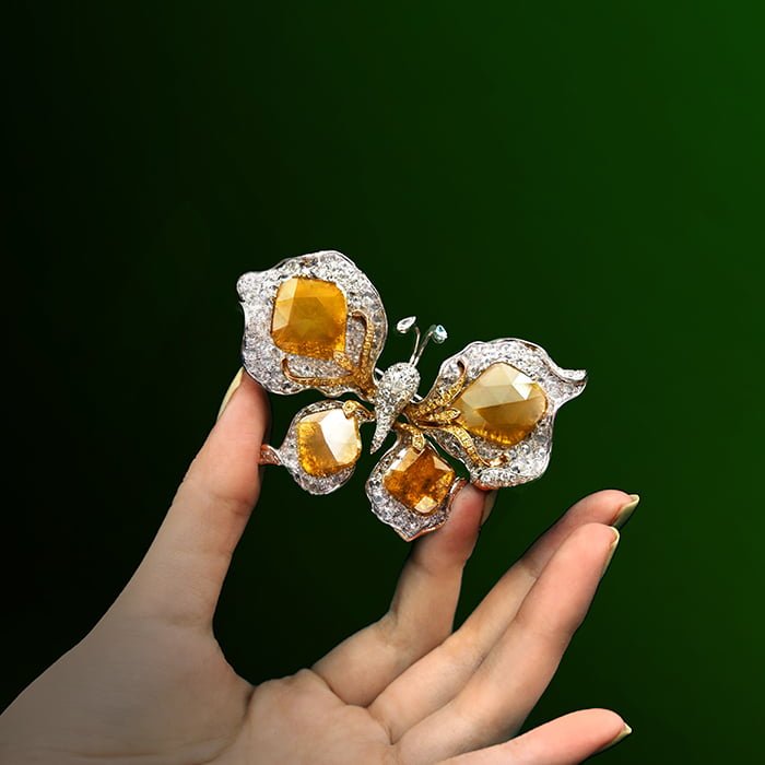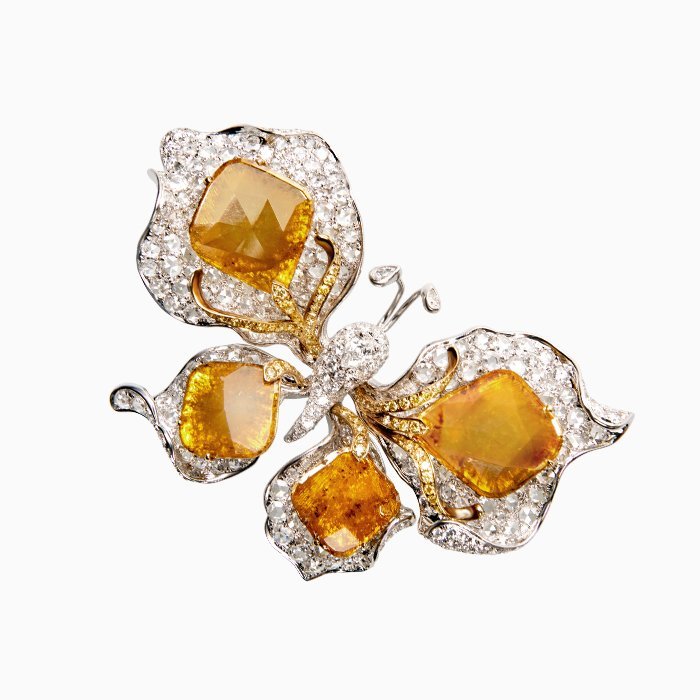 18K黃金與18K白金材質, 黃鑽片, 梨形切割鑽石, 玫瑰式切割鑽石與白鑽石。 胸墜兩用。