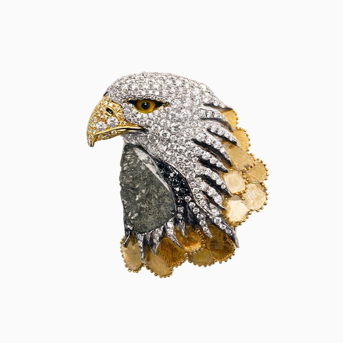 18K黃金與18K白金材質, 黑鑽片, 黃鑽片, 黃鑽石, 黑鑽石, 黃玉髓, 黑瑪瑙與白鑽石。 胸墜兩用。