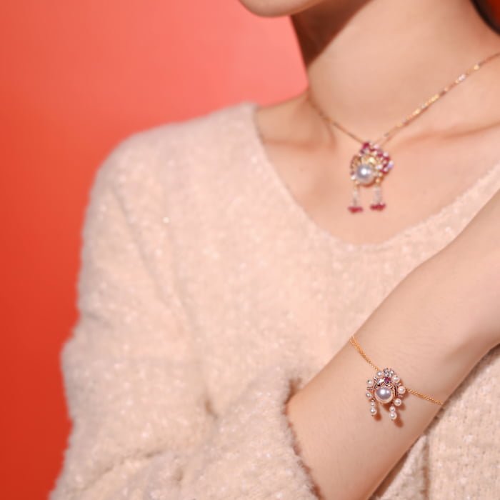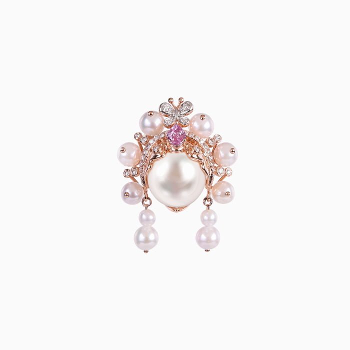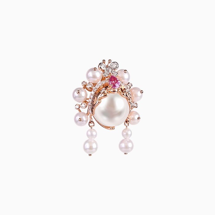 18K黃金材質, 日本珍珠, 彩剛與白鑽石。