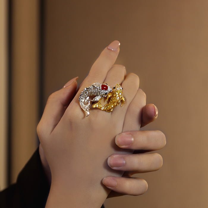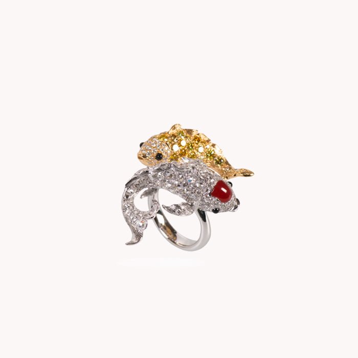 18K黃金與18K白金材質, 珊瑚, 黃鑽石, 玫瑰式切割鑽石, 黑瑪瑙與白鑽石。