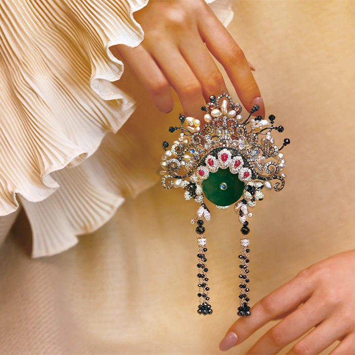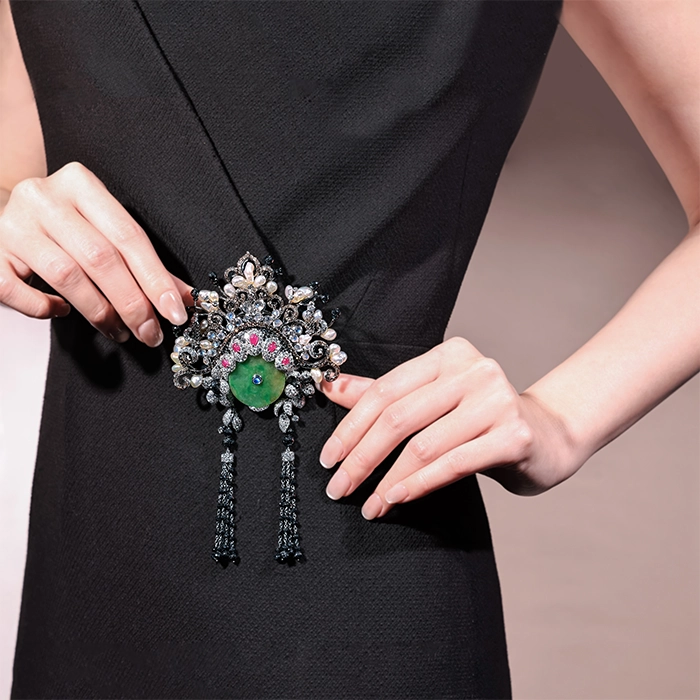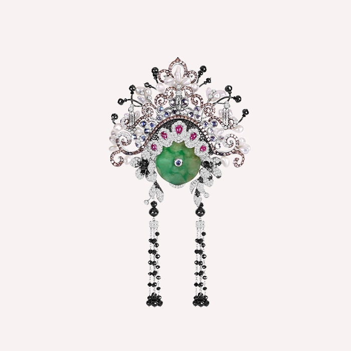 18K白金材質與18K黑金材質, 緬甸翡翠, 紅寶石, 無核珍珠, 月光石, 黑鑽石, 彩鑽與H&A圓鑽。 胸墜兩用。