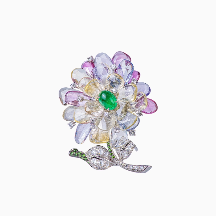 18K白金材質, 祖母綠,彩色剛玉,玫瑰車工鑽石,沙弗萊石與白鑽石。