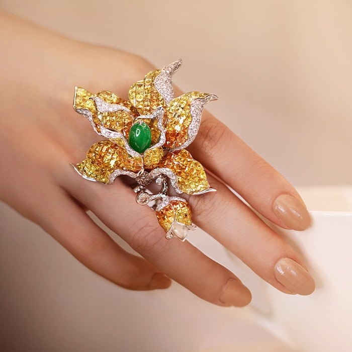 18K白金材質, 緬甸翡翠, 緬甸冰翡, 黃寶石, 彩鑽, 玫瑰式切割鑽石與白鑽石。