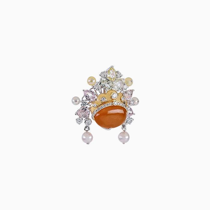 18K黃金與18K白金材質, 緬甸產冰翡, 黃翡, 日本珍珠, 彩剛與白鑽石。 胸墜兩用。 ・迷你臉譜系列 № 29 作品