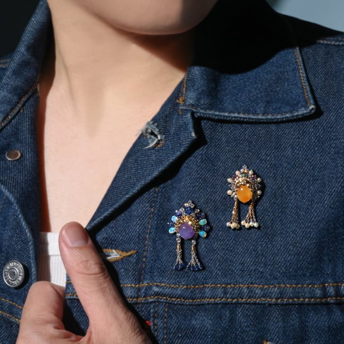 18K黃金與18K白金材質, 緬甸黃翡, 日本珍珠, 剛玉與白鑽石。 ・迷你臉譜系列 № 53 作品