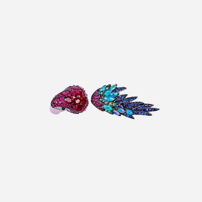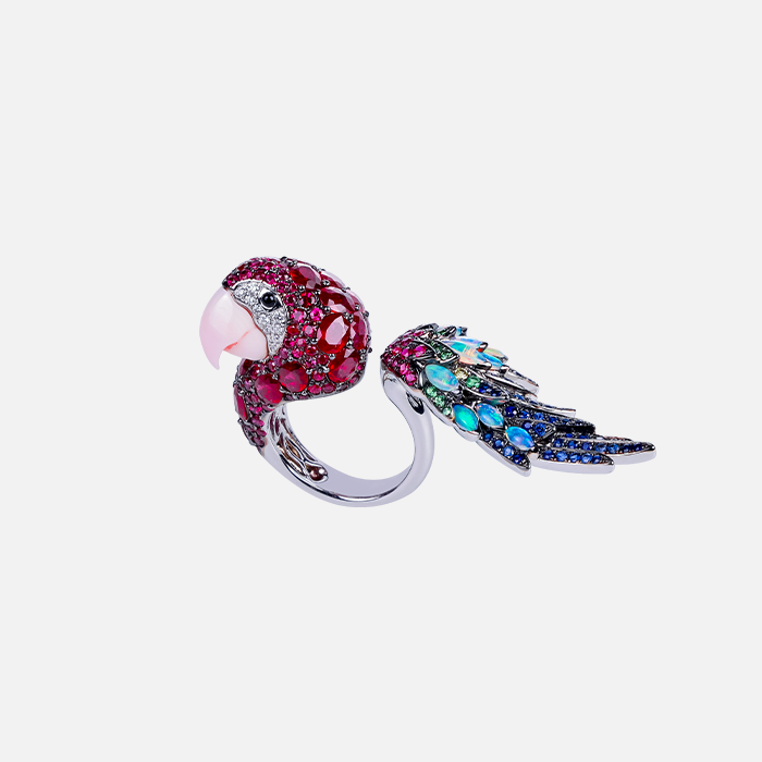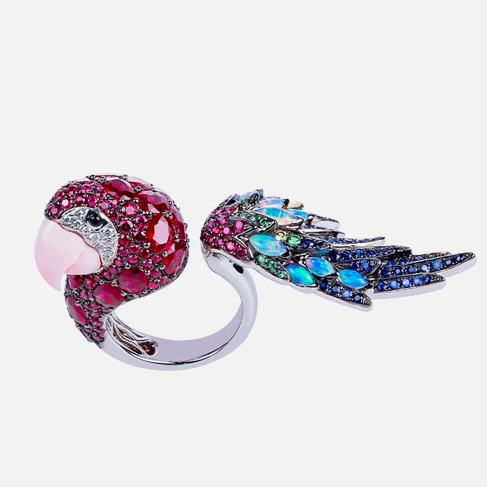 天然紅寶鑽石戒指 18K白金材質, 紅寶石, 蛋白石, 藍寶石, 黃寶石, 沙弗萊石, 珍珠母貝, 黑瑪瑙與白鑽石。