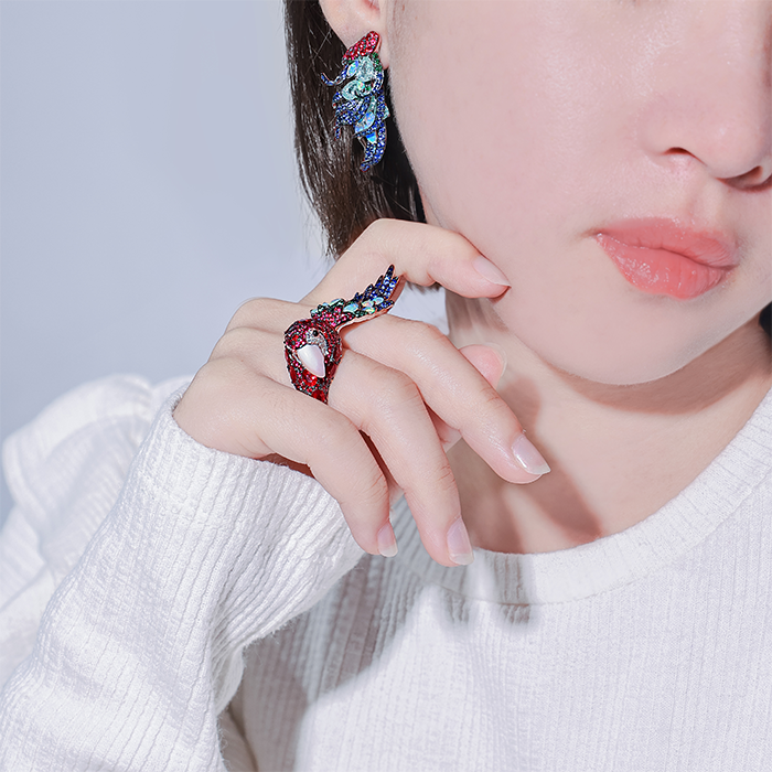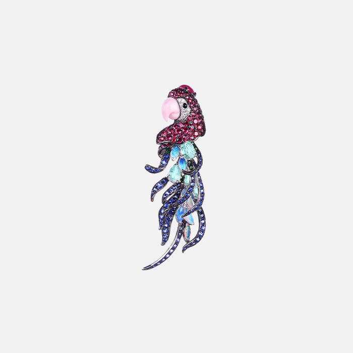 天然紅寶鑽石耳環 18K白金材質, 紅寶石, 蛋白石, 藍寶石, 碧璽, 沙弗萊石, 海螺貝, 黑瑪瑙與白鑽石。
