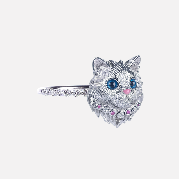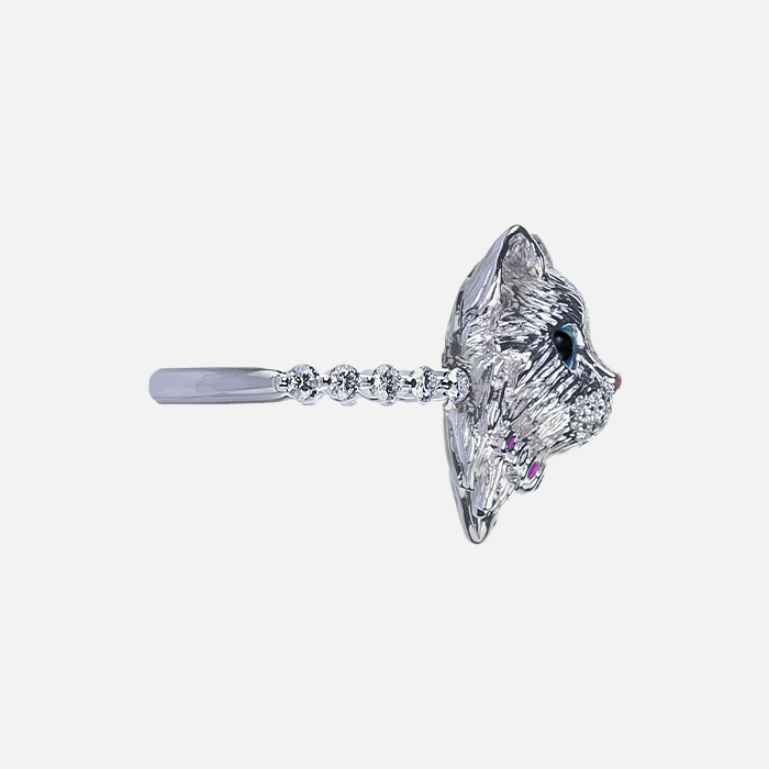 天然白水晶鑽石戒指 18K白金材質, 粉剛, 白水晶, 琺瑯, 黑瑪瑙與白鑽石。