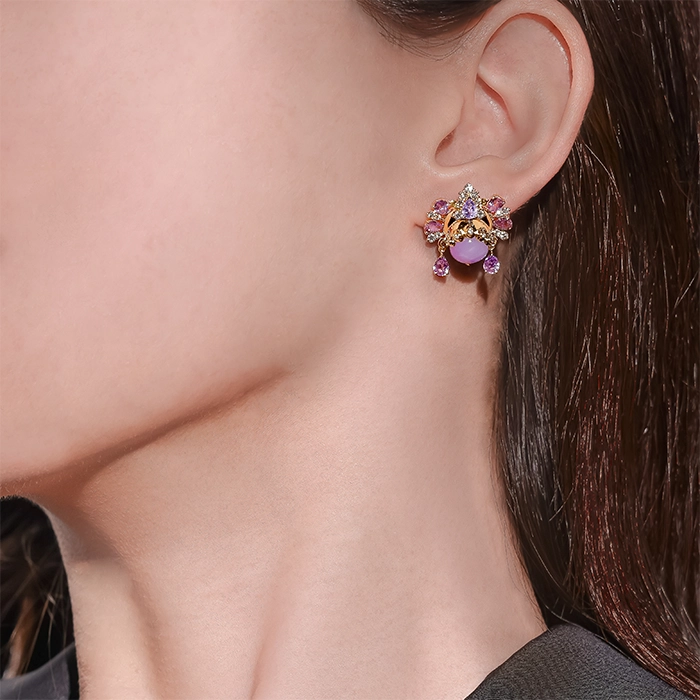 18K黃金材質, 緬甸產天然黃翡, 緬甸產天然紫翡, 粉色剛玉, 變色石, 黃鑽石與白鑽石。 ・迷你臉譜系列 № 96 作品