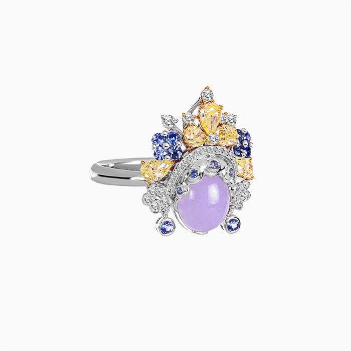 18K白金材質與18K黃金材質, 緬甸產天然紫翡, 黃鑽石,藍寶石與白鑽石。 ・迷你臉譜系列 № 138作品
